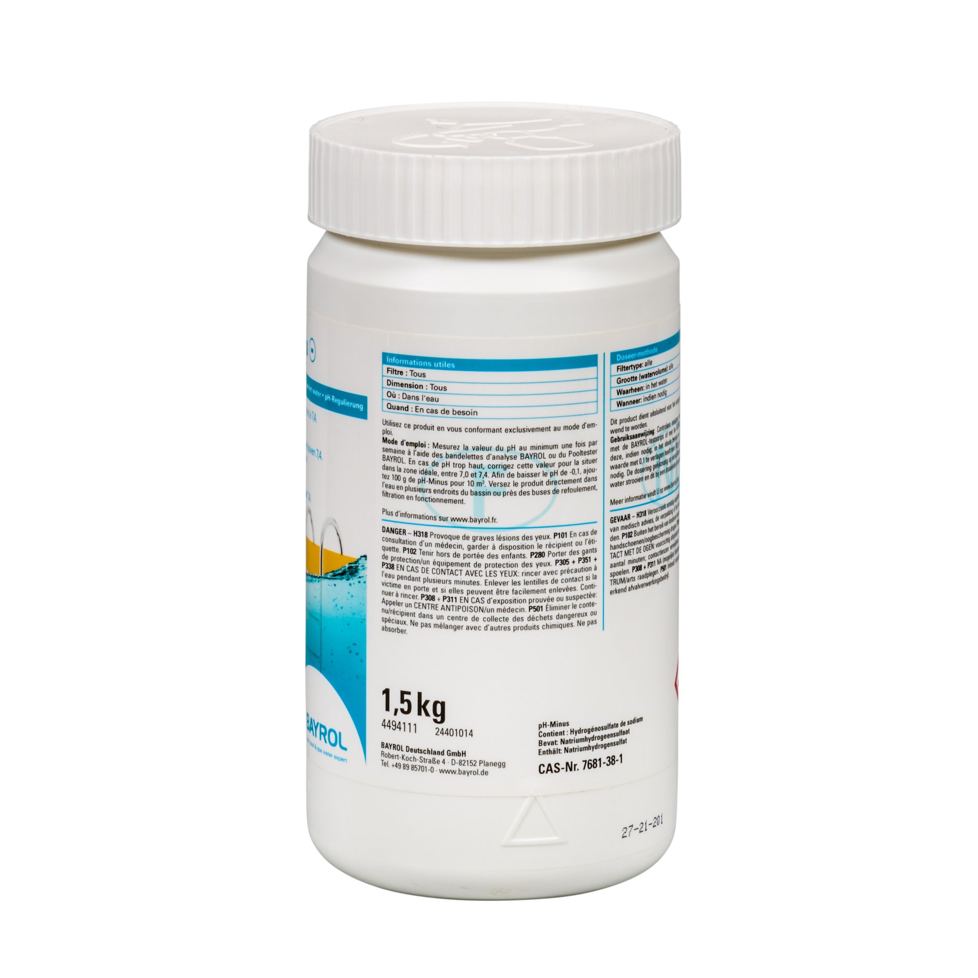 Utilisez la poudre/les granulés pH-Min pour réduire le pH de l'eau de votre piscine lorsqu'il est supérieur à 7,6. Un pH correct est essentiel pour la qualité de l'eau et garantit l'efficacité du chlore et des autres produits.