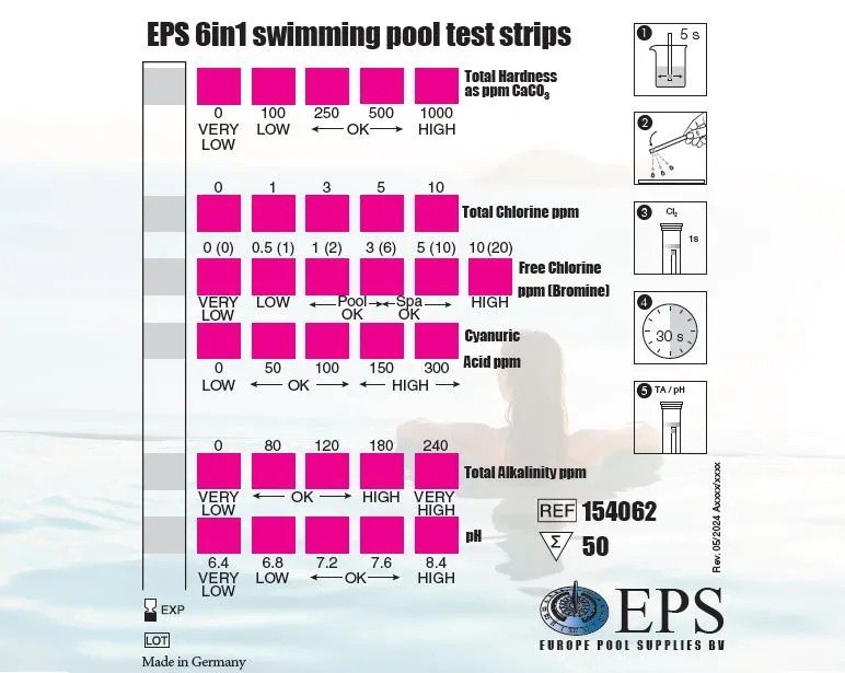 Bandelettes de test 6 en 1 pour l'analyse de l'eau de piscine.